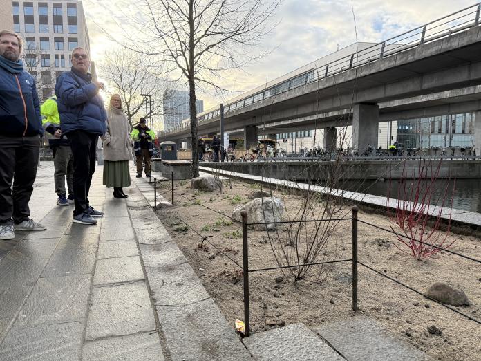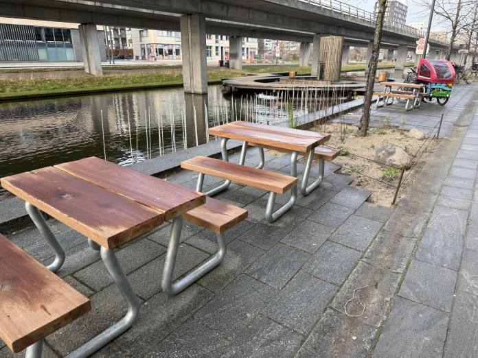 Langs kanalen er dele af belægningen fjernet for at give plads til blomsterbede med buske, planter og sten. Samtidig er der opsat nye bænke, stole og plantekummer, som inviterer elever, beboere og forbipasserende til at slå sig ned og bruge området.